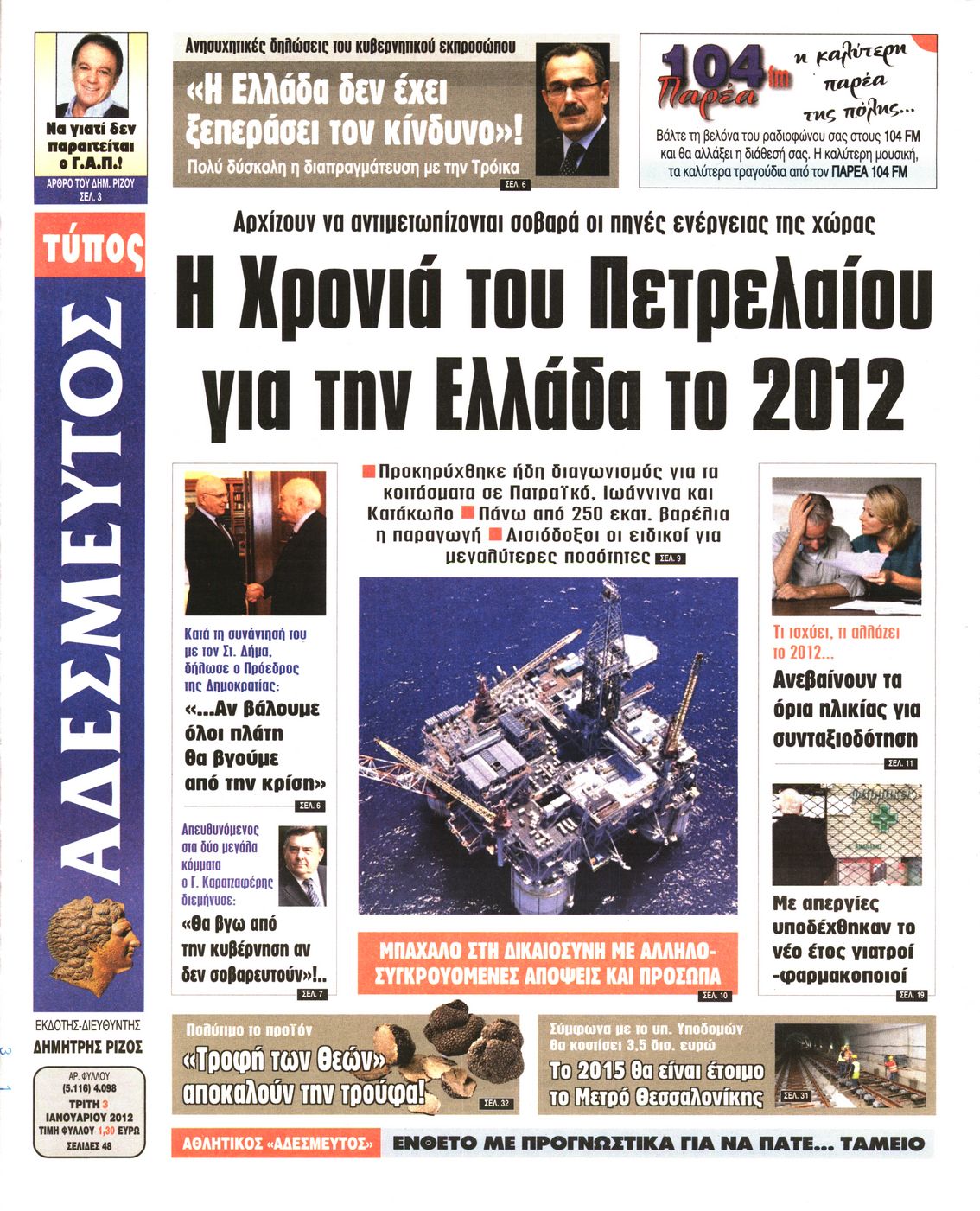 ΤΟ ΠΡΩΤΟΣΕΛΙΔΟ ΤΗΣ ΗΜΕΡΑΣ 3/1/2012