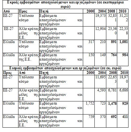 2010 οι αντίστοιχες εκροές ανήλθαν σε 1,081 δις ευρω (από την Ελλάδα προς τον