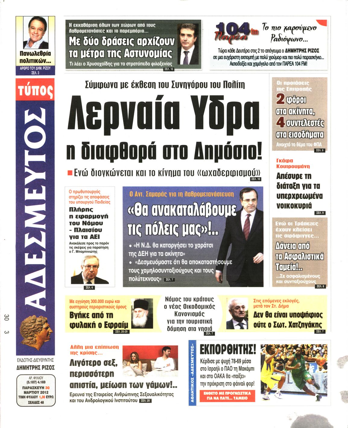 ΤΟ ΠΡΩΤΟΣΕΛΙΔΟ ΤΗΣ ΗΜΕΡΑΣ!!! 30/3/2012