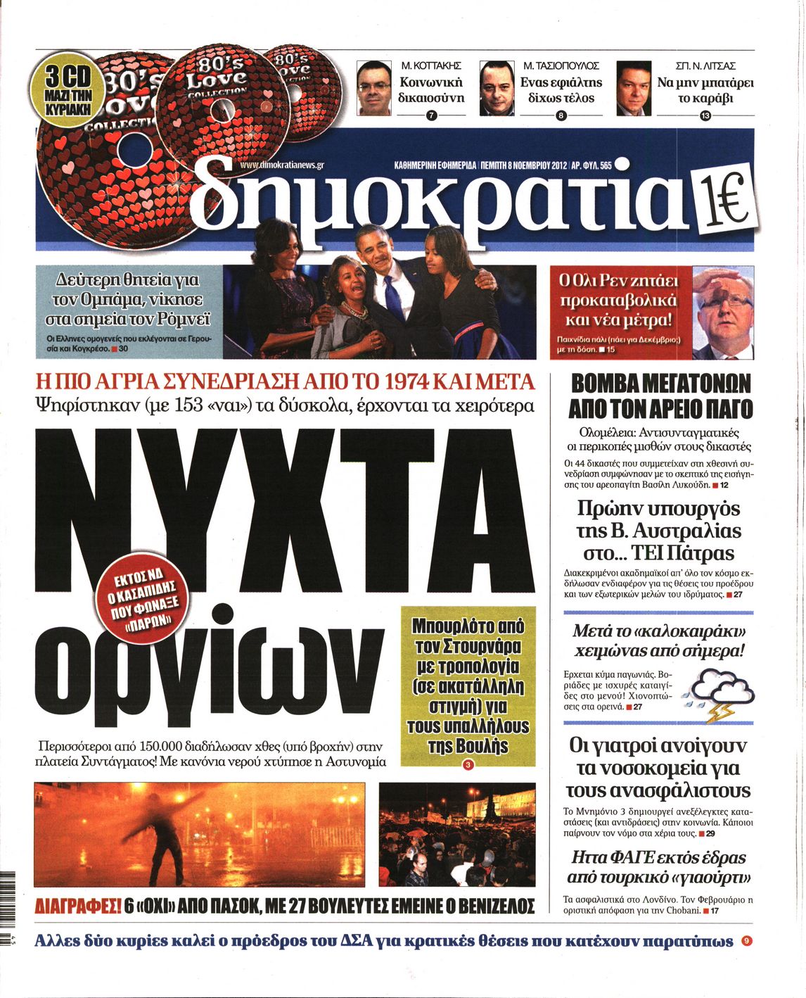 Το πρωτοσέλιδο της ημέρας 8/11/2012
