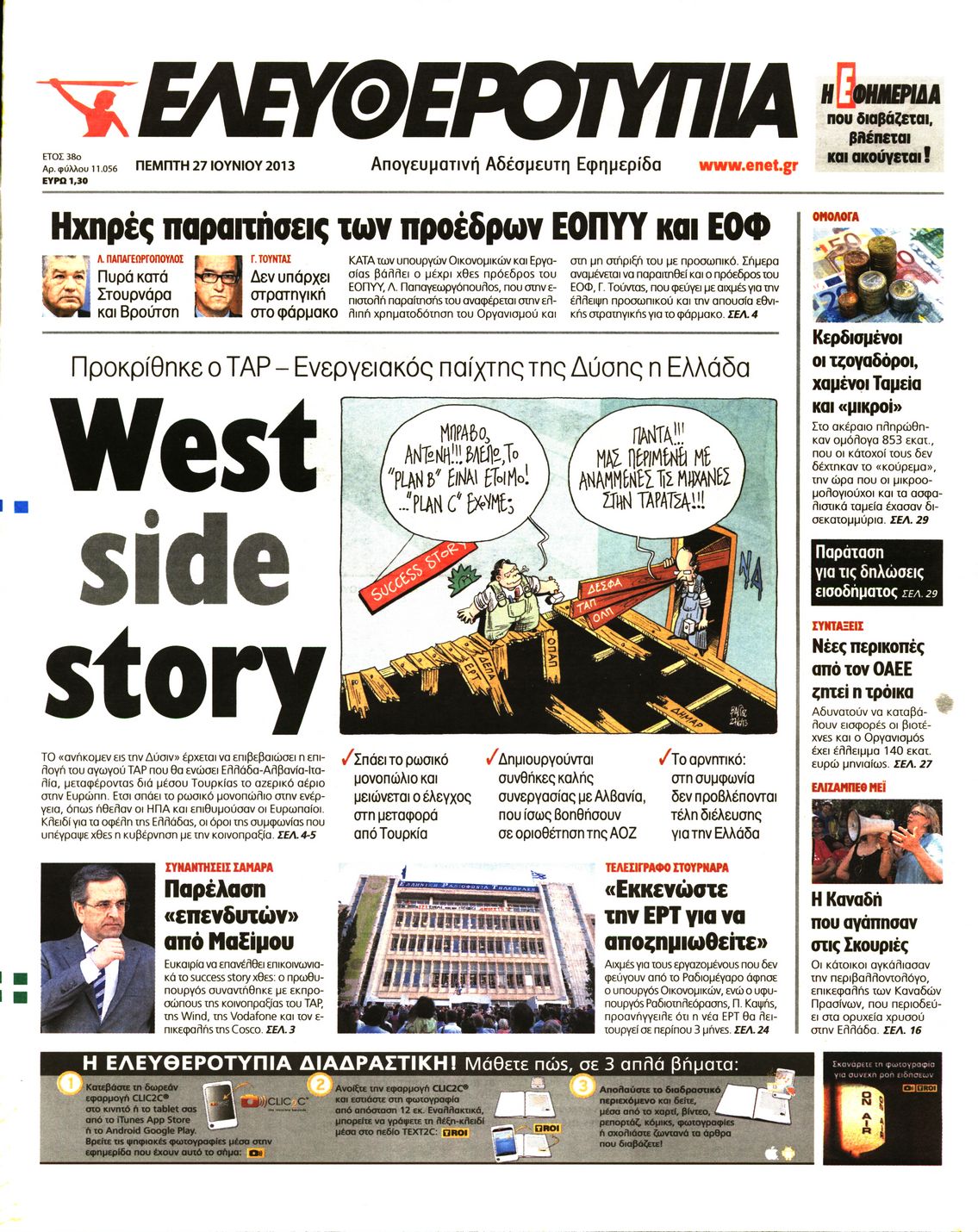 Το πρωτοσέλιδο της ημέρας 27/6/2013