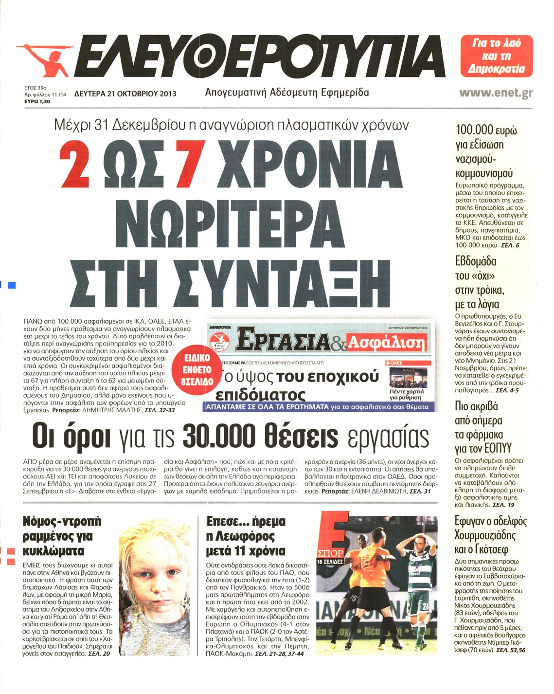 Το πρωτοσέλιδο της ημέρας 21/10/2013