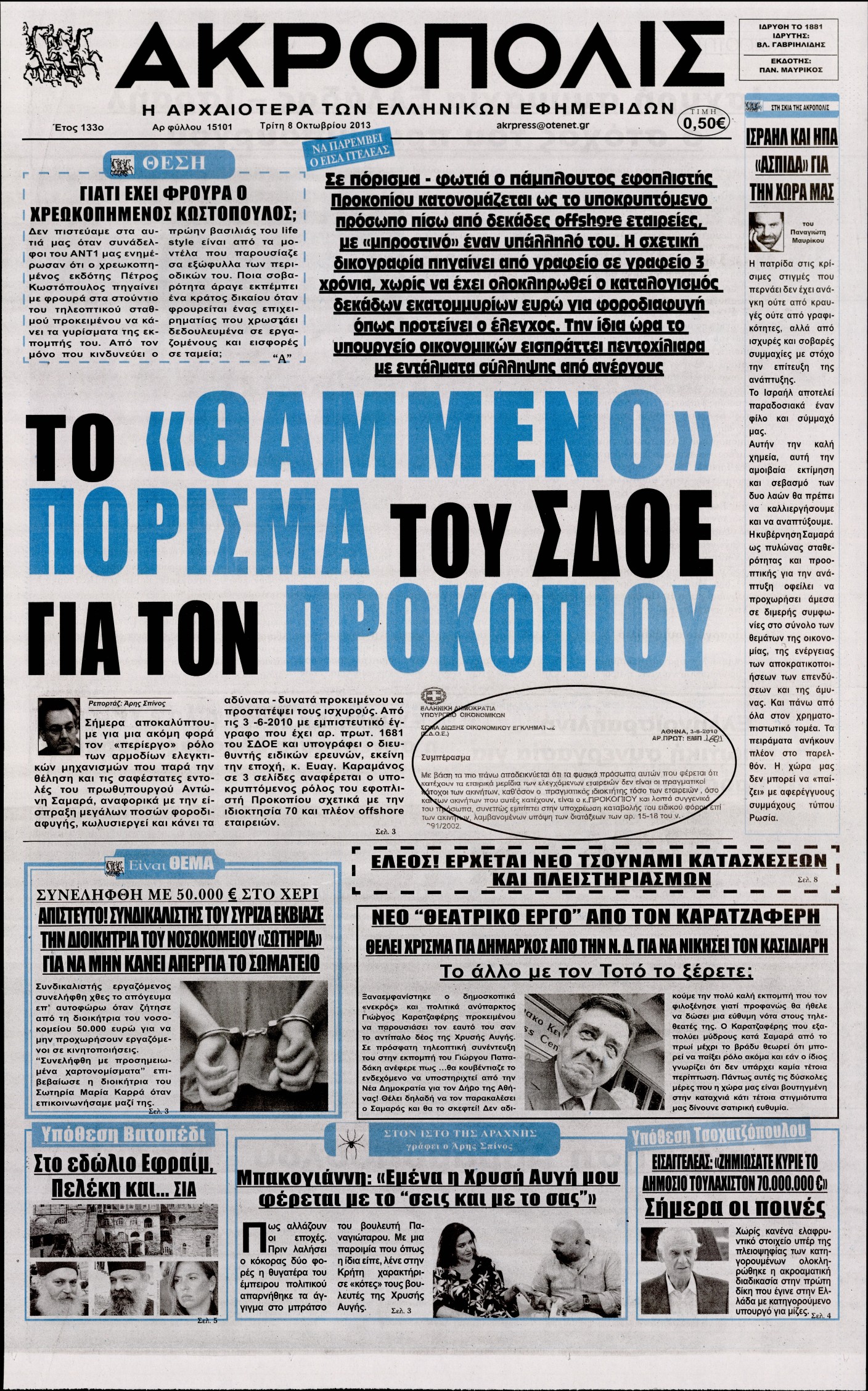 Το πρωτοσέλιδο της ημέρας 8/10/2013