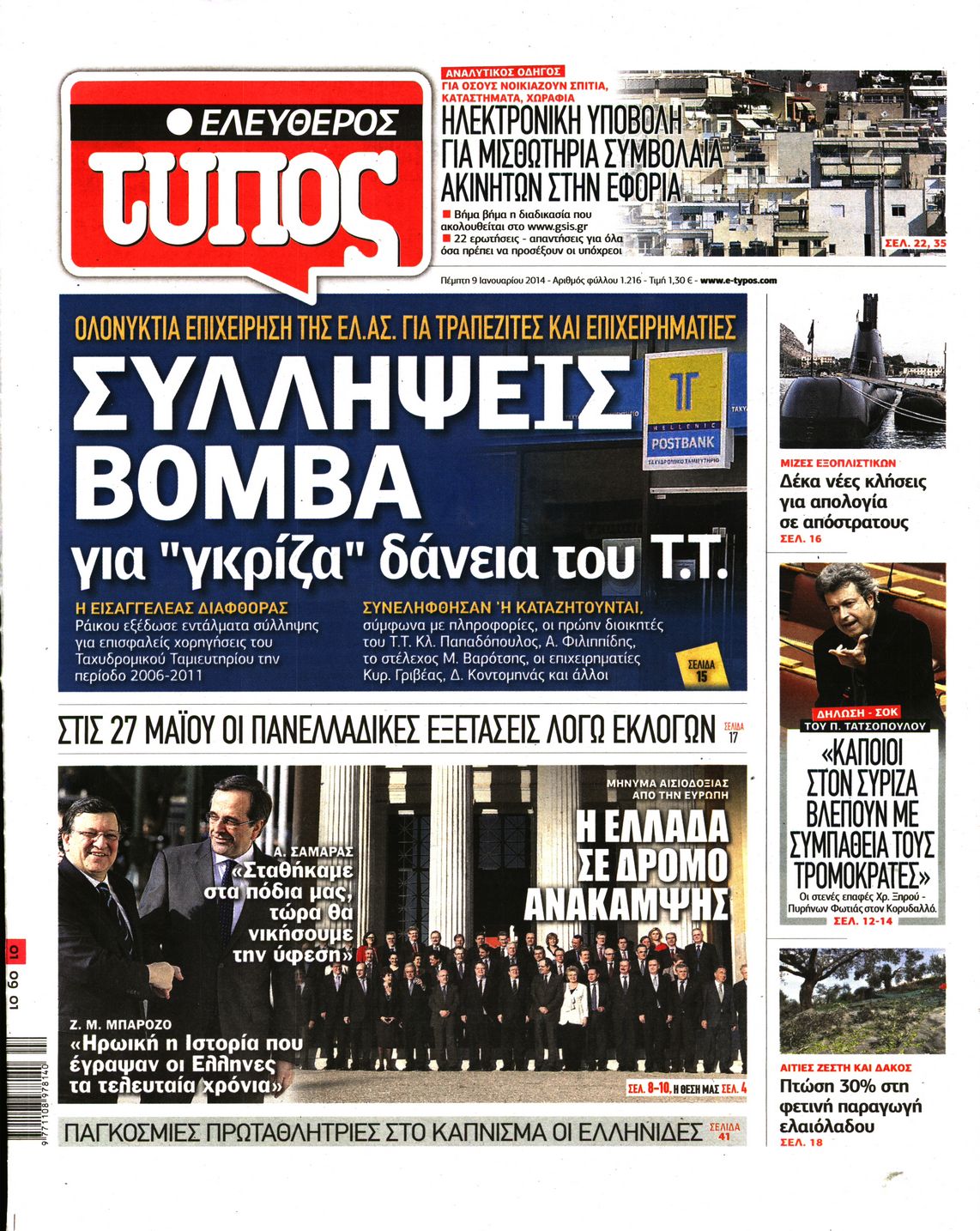 Το πρωτοσέλιδο της ημέρας 9/1/2014