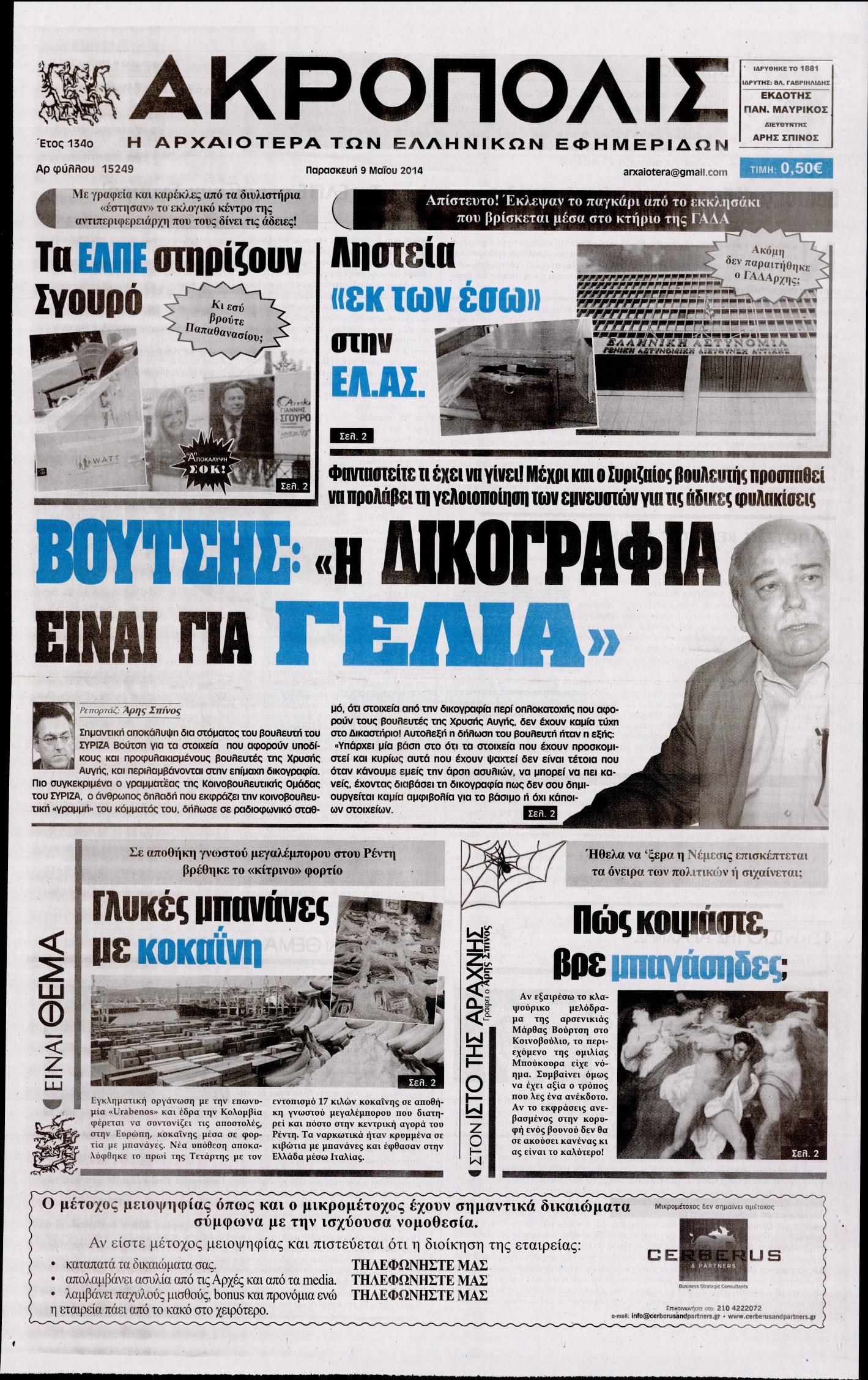 Το πρωτοσέλιδο της ημέρας 9/5/2014