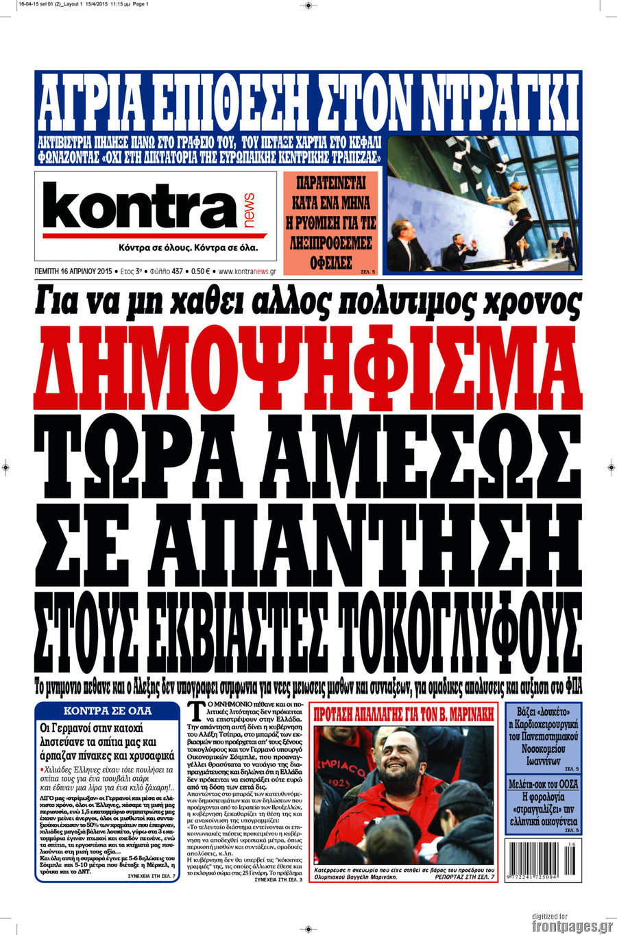 Το πρωτοσέλιδο της ημέρας 16/4/2015
