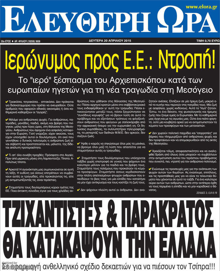 Το πρωτοσέλιδο της ημερας 20/4/2015
