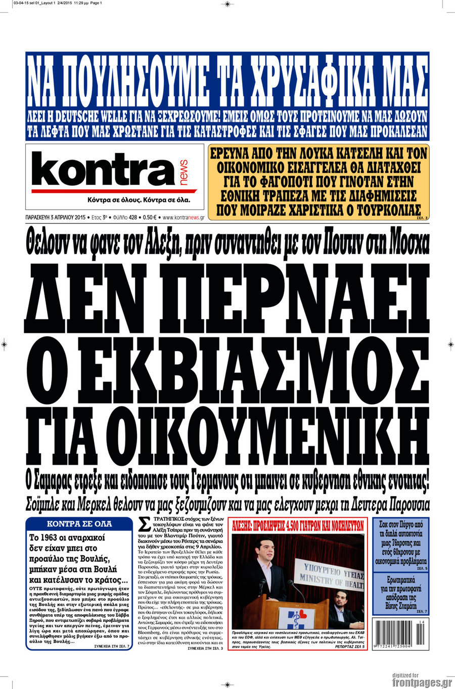 Το πρωτοσέλιδο της ημέρας 3/4/2015