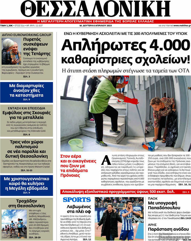 Το πρωτοσέλιδο της ημέρας 6/4/2015