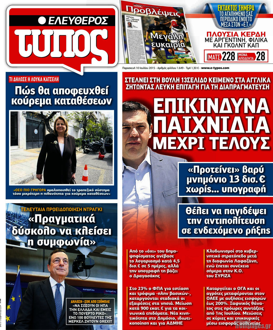 Το πρωτοσέλιδο της ημέρας 10/7/2015