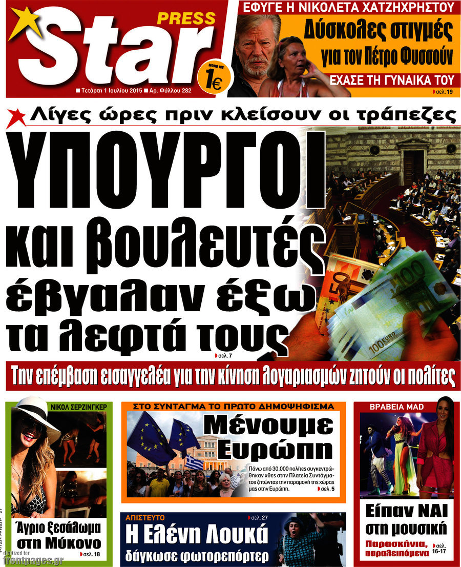Το πρωτοσέλιδο της ημέρας 1/7/2015