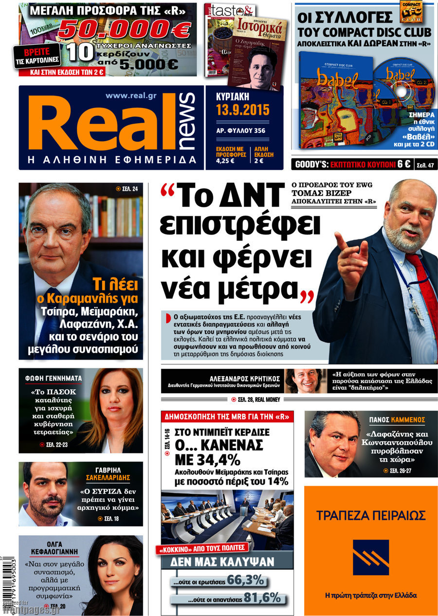 Το πρωτοσέλιδο της ημέρας 13/9/2015