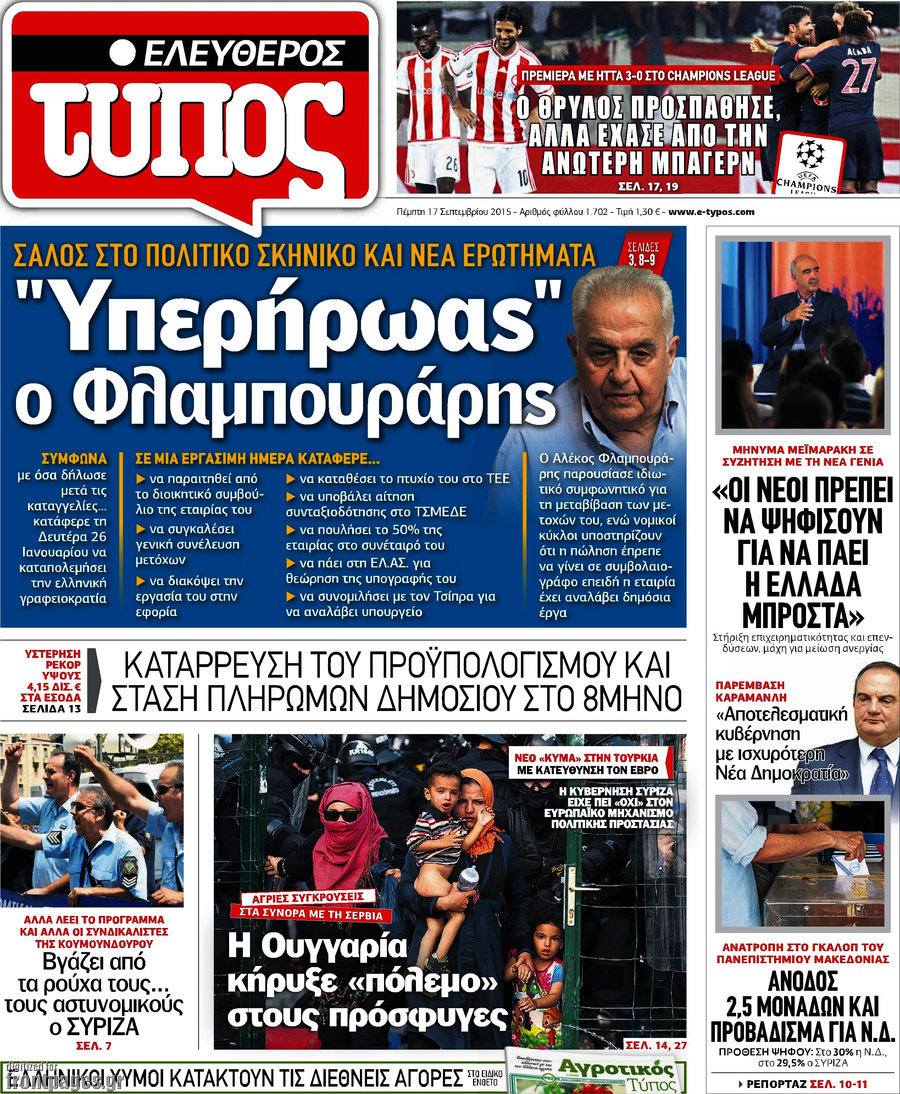 Το πρωτοσέλιδο της ημέρας 17/9/2015