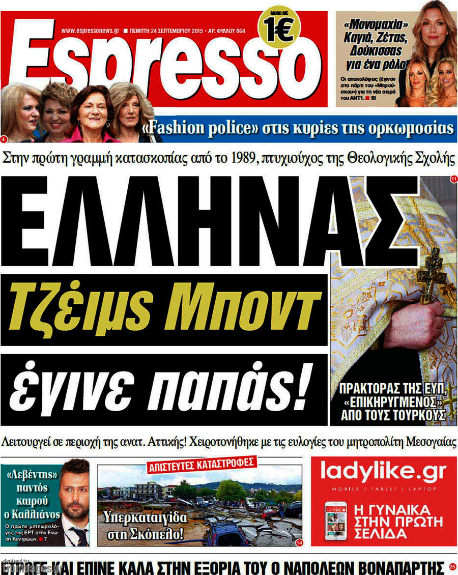 Το πρωτοσέλιδο της ημέρας 24/9/2015
