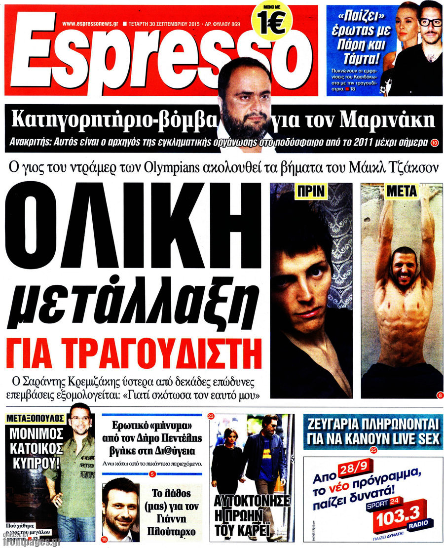 Το πρωτοσέλιδο της ημέρας 30/9/2015