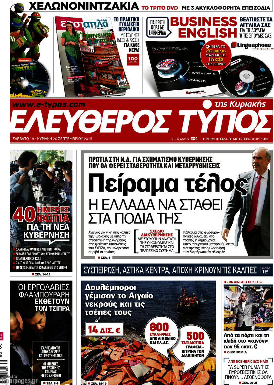 Το πρωτοσέλιδο της ημέρας 20/9/2015