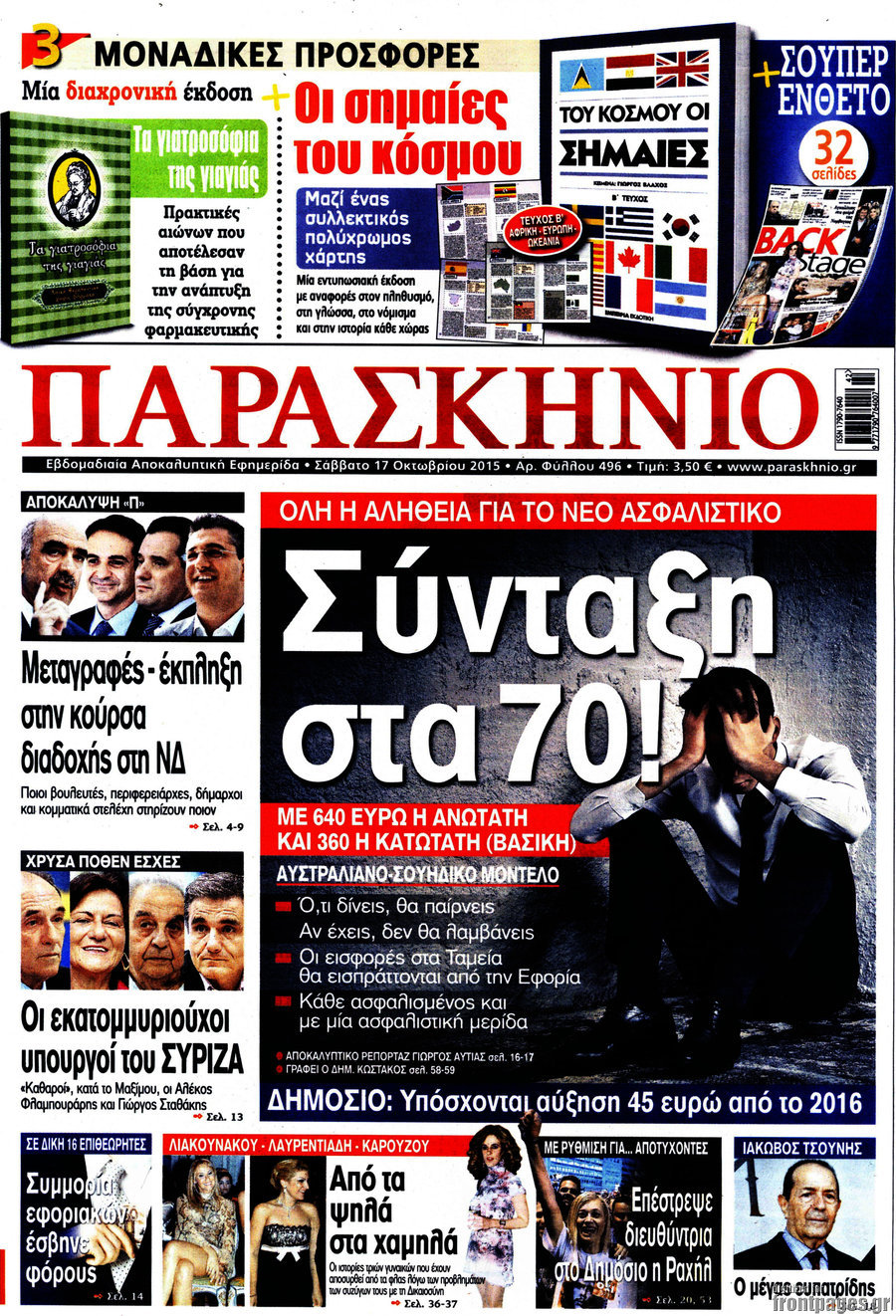 Το πρωτοσέλιδο της ημέρας 17/10/2015