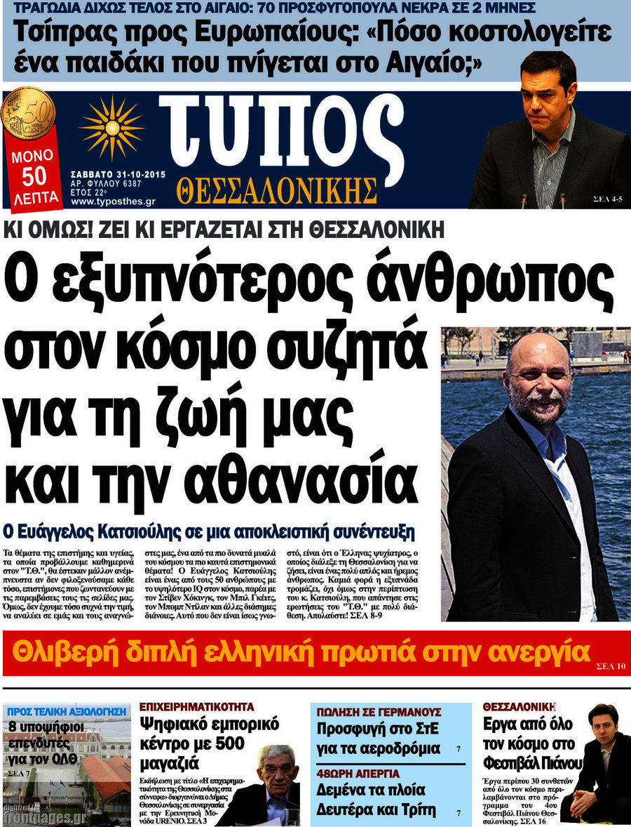 Το πρωτοσέλιδο της ημέρας 31/10/2015