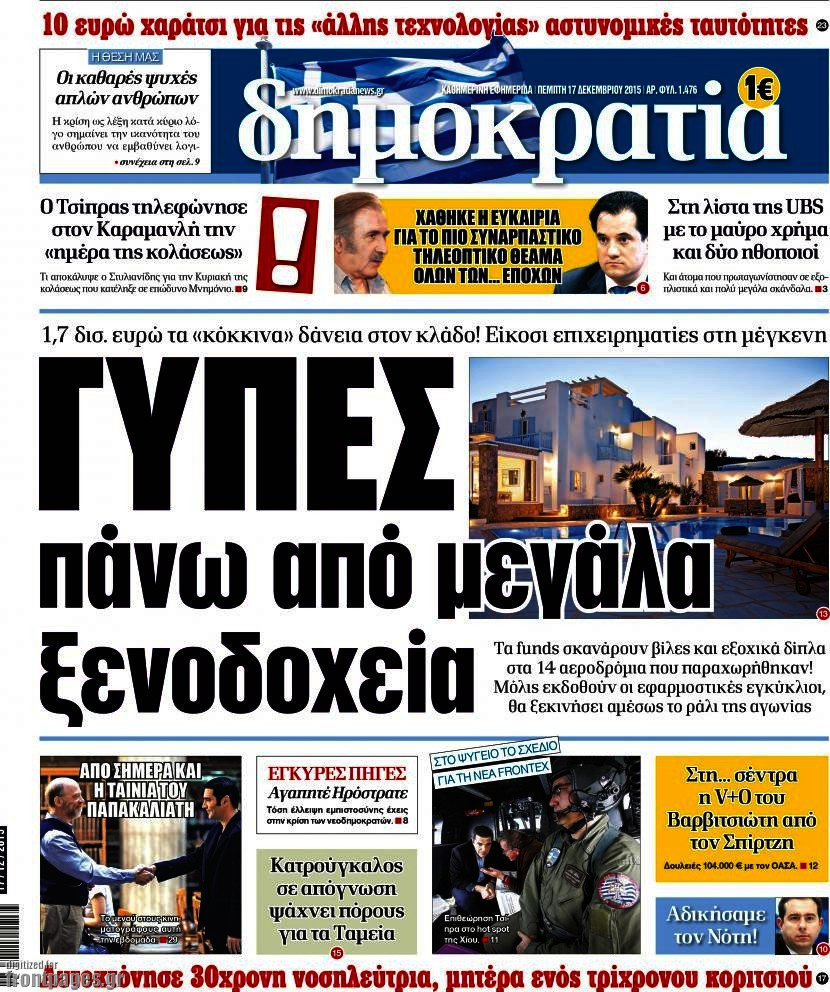 Το πρωτοσέλιδο της ημέρας 17/12/2015