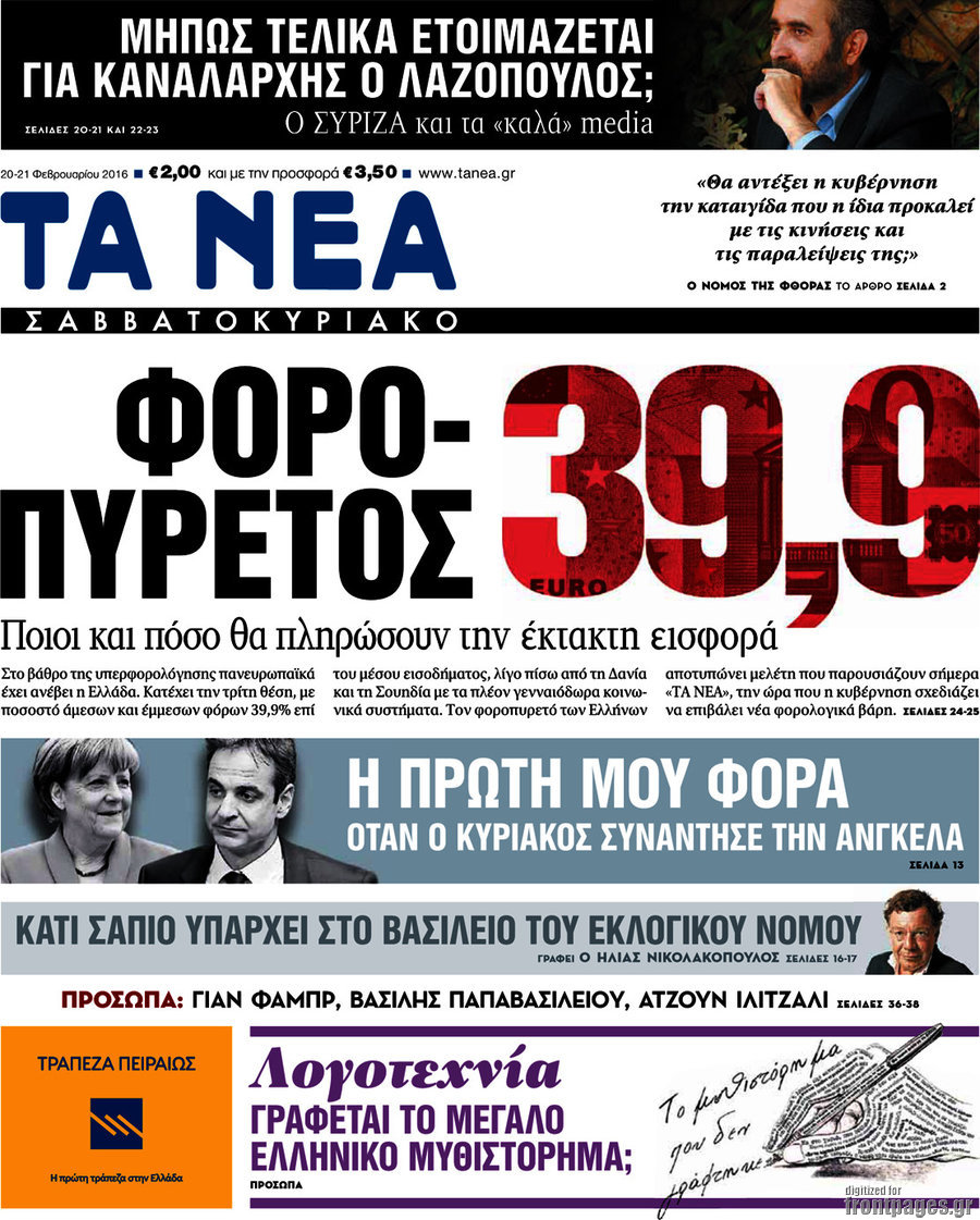 Το πρωτοσέλιδο της ημέρας 20/2/2016