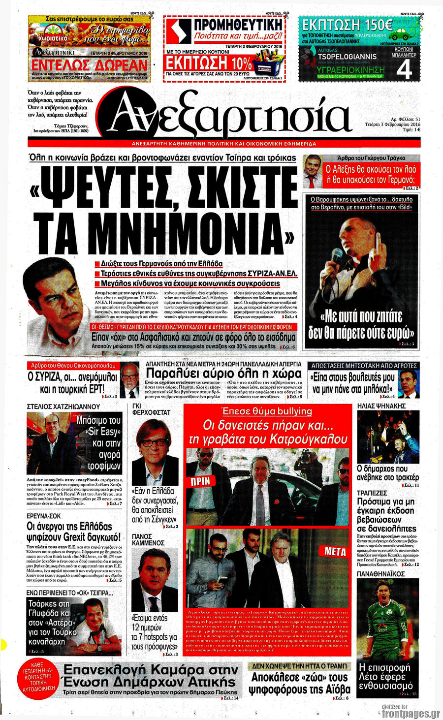 Το πρωτοσέλιδο της χθεσινής ημέρας