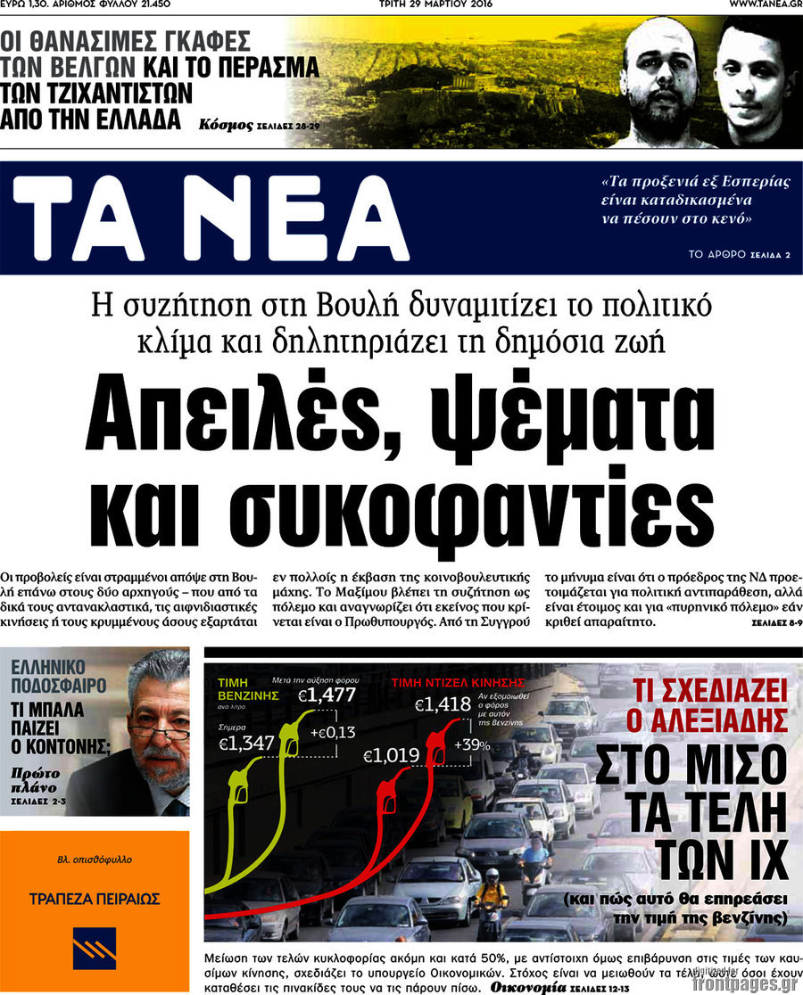 Το πρωτοσέλιδο της ημέρας 28/3/2016