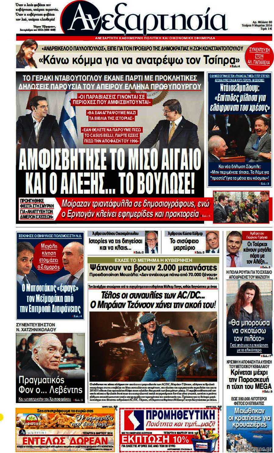 Το πρωτοσέλιδο της ημέρας 9/3/2016