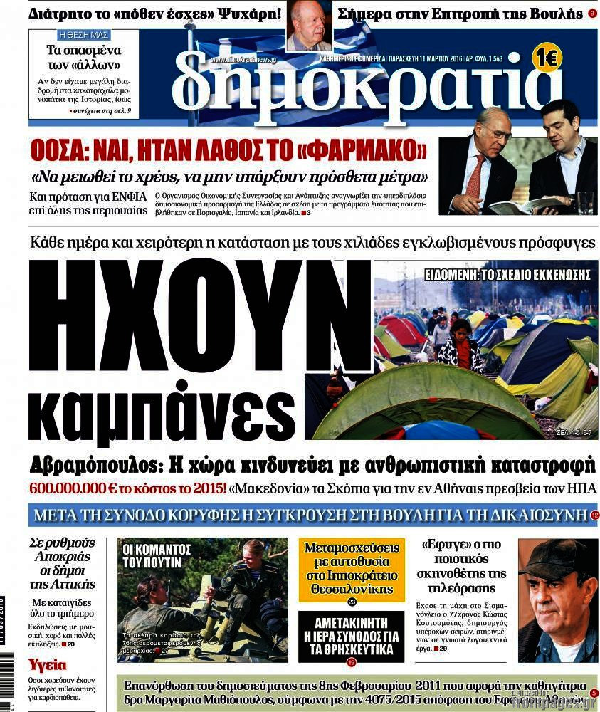 Tο πρωτοσέλιδο της ημέρας 11/3/2016