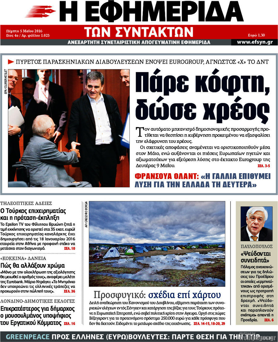 Το πρωτοσέλιδο της ημέρας 5/5/2016