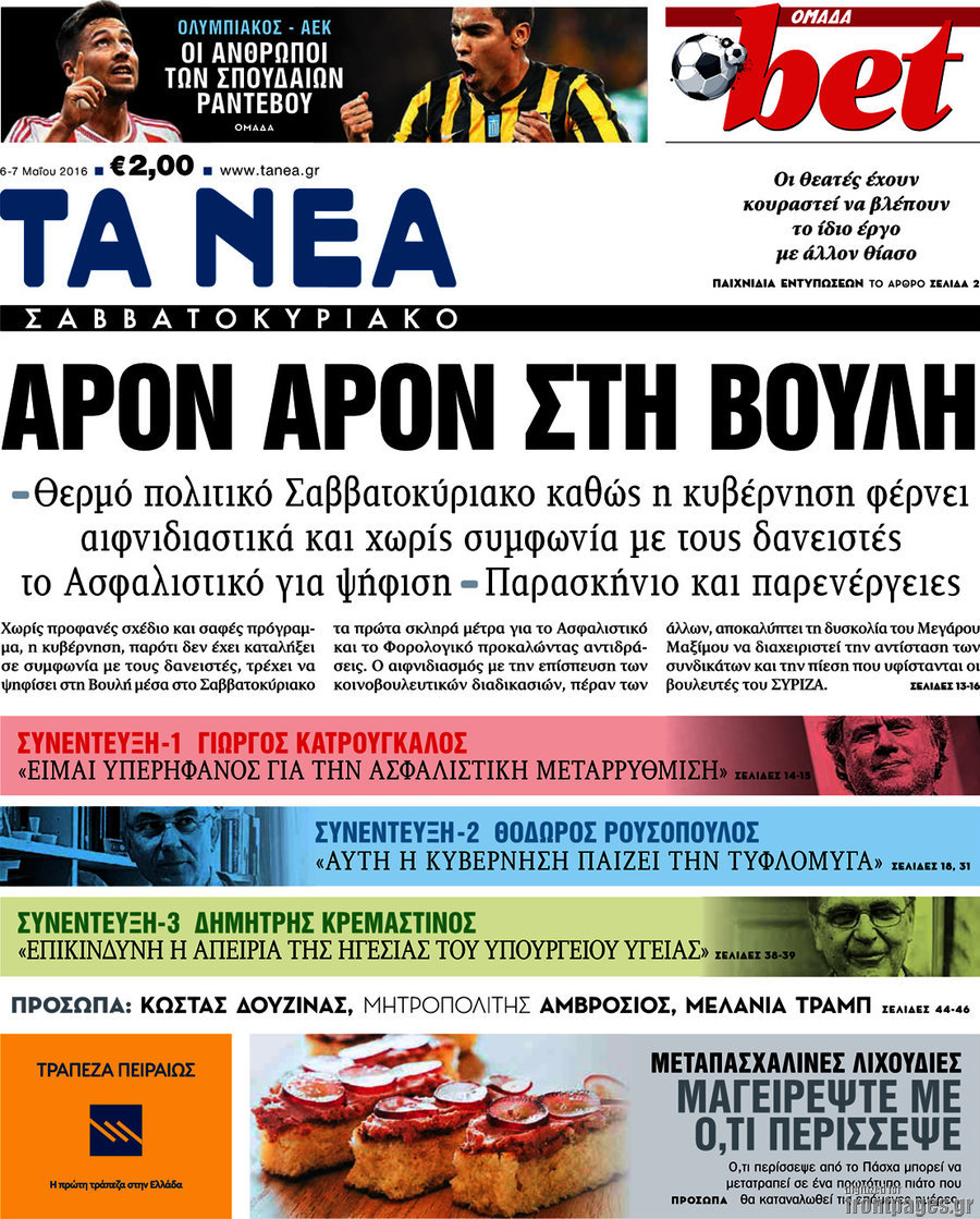 Το πρωτοσέλιδο της ημέρας 6/5/2016